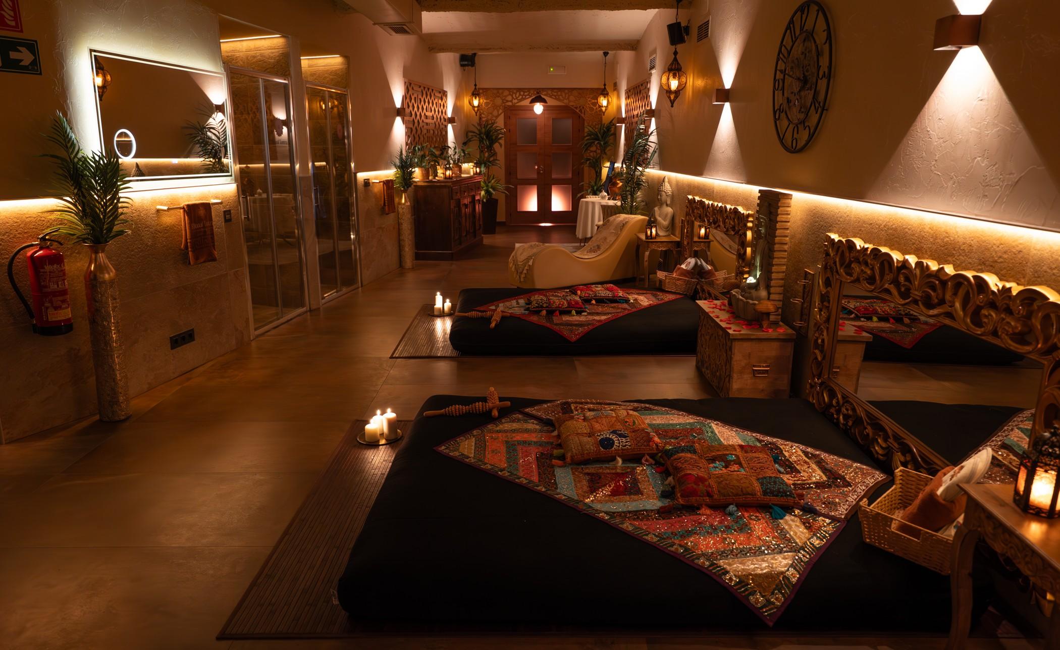 Masajes Diván Tántrico: Realizados en un diván tántrico combinado con tatamis clásicos, ideales para explorar nuevas posturas y sensaciones.